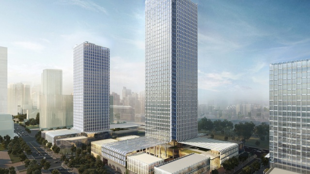 滨江城开中心位于云锦路以东、丰谷路以南,占地77000平方米,地上总建筑面积28.5万平方米,由国际顶级事务所KPF担纲设计。